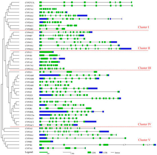 To better understand the evolutionary relationship among cCYPs, a phylogenetic tree of the 45 cCYPs was constructed (Figure 2). The phylogenetic tree was also divided into five clusters, and the results were very similar to the cluster classification results shown in Figure 1. Subsequently, the exon–intron structures of the genes were investigated to elucidate the gene structural evolution (Figure 2). The results showed that cCYP1C1 was the shortest (1.2 kb) and had only one exon. In contrast, cCYP46A1 had the most exons (15), and cCYP7A1 was the longest gene (12.8 kb). For the cCYP1 subfamily, there were four members with three different exon numbers, which was also observed with the cCYP26 subfamily. However, most cCYP2 subfamily members (13/17) had nine exons. The constant exon numbers in the cCYP2 subfamily supports their close evolutionary relationship and further indicated that the CYP2 subfamily may have undergone gene duplication events during evolutionary history. Chromosomal location analyses showed that 42 cCYPs were distributed in 13 chromosomes, and the other three cCYPs were located on three scaffold regions (Table S2). Interestingly, we found that most cCYPs (39/45) were located on chromosomes 2–10 and 14. Only cCYP2D6 was located on chromosome 1, which was the longest chromosome in the chicken genome. Moreover, no cCYPs were found to be located on macrochromosome Z. These data strongly suggested that cCYP distributions were not random. Overall, the gene characteristic investigation revealed high divergence of cCYPs.