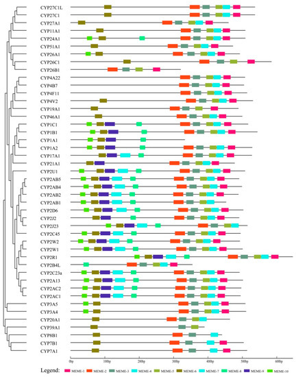 To further elucidate cCYP evolution, the MEME program was used to identify the conserved motifs in protein sequences. The distribution of the 10 most enriched motifs is shown in Figure 3, among which, motifs 1–4 were annotated as the cytochrome p450 domain. All of the identified cCYPs contained motif 3, indicating that all of the identified cCYPs were typical of the P450 family. Results showed that genes in one cluster generally have the same motifs. For example, motifs 1–5 were conserved in clusters I, II, III, and IV, with the exception of cCYP1C1. Motif 9 was conserved in clusters III and IV, but was not identified in other clusters. Additionally, the majority of cCYPs contained motifs 1–5 with some exceptions. Specifically, motifs 8 and 9 were particularly conserved in clusters III and IV. In addition, along with all of the conserved motifs, most cCYP2 subfamily members have the specific motif 10 at the N-terminal region. Taken together, the conserved motifs and the sequential order of these motifs in the same cluster showed a high similarity.