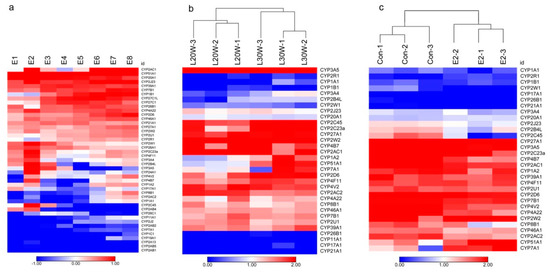 Figure 4. Heat maps showing the mRNA expression profiles of cCYPs. (a) Expression profiles of cCYPs in developmental stages of chicken embryos. (b) Expression profiles of cCYPs in the liver of pre-laying and laying hens. (c) Expression profiles of cCYPs in the liver of 17β-estradiol treated and non-treated chickens. The genes expression levels were obtained based on transcriptional data. The relative expression was log transformed and visualized as heat maps.