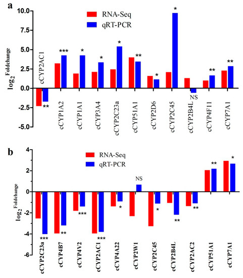 The chicken liver, one of the most important metabolic organs, synthesizes massive amounts of protein and lipids to meet the needs for egg-yolk formation during the laying period. Therefore, there exists a huge difference in the metabolic level of the livers between pre-laying and laying hens. To understand the potential of cCYPs in chicken liver metabolism, we constructed cCYP expression profiles in different stages (20 week old pre-laying hens and 30 week old laying hens) of chicken liver by transcriptome analysis. As results, we identified 31 expressed cCYPs (FPKM > 0.5) and their expression profiles were shown in Figure 4b. Eleven of them were differentially expressed (Table 1; |log2fold change| > 1 and false discovery rate (FDR) < 0.05). These 11 differentially expressed genes were validated by qRT-PCR with the exception of cCYP2B4L (Figure 5a). Notably, all differentially expressed genes were upregulated in the liver of laying chickens compared with the liver of pre-laying chickens with the exception of cCYP2AC1; cCYP2AC1 was downregulated about five-fold. During the laying stage, gene expression is highly stimulated in the liver to support the metabolic changes associated with the development of the reproductive organs [21]. Significantly regulated cCYPs in the liver indicated these cCYP members may play an important role in liver metabolic processes.