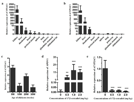 Figure 6. Expression characteristics and regulation of cCYP2AC1. (a) Tissue distribution of cCYP2AC1 in 10 week old chicken tissues. (b) Tissue distribution of cCYP2AC1 in 30 week old chicken tissues. (c) Expression patterns of cCYP2AC1 in livers of chickens at different developmental stages. (d) Effect of 17β-estradiol on APOV1 mRNA expressions in the liver of chickens. (e) Effect of 17β-estradiol on cCYP2AC1 mRNA expressions in the liver of chickens. Each data point represents the mean ± SD (n = 3–6; t-test; ** p < 0.01; *** p < 0.001; NS p > 0.05).