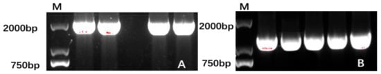 We obtained the 3′ and 5′ terminal sequence and intermediate fragment sequences of Cf4CL and CfCCoAOMT by sequencing. The Cf4CL intermediate fragment was 843 bp in length, and its full-length spliced cDNA was 2065 bp long, of which 1665 bp encoded 554 amino acids (Figure 1A). The CfCCoAOMT intermediate fragment was 685 bp in length, and its full-length spliced cDNA was 1219 bp long, of which 750 bp encoded 249 amino acids (Figure 1B).