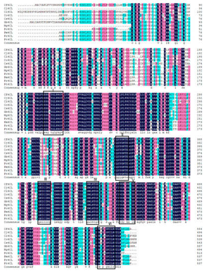 Multiple sequence alignment of the 4CL protein using 10 plant species. The species represented by the abbreviations on the left side of the figure and their registration numbers in NCBI are as follows: Cf4CL (C. fortunei, MK236392), Cj4CL (C. japonica, AFJ73433.1), Mg4CL (Metasequoia glyptostroboides, AFJ73430.1), Pc4CL (Pseudotaxus chienii, AFJ73459.1), Gb4CL (Ginkgo biloba, AMN10098.1), Pm4CL (Pinus massoniana, ACO40513.1), Pt4CL (P. taeda, AAA92669.1), Pr4CL (P. radiate, ACF35279.1), Cl4CL (Cunninghamia lanceolate, AFX98059.1), Co4CL (Cinnamomum osmophloeum, AFG26323.1), Cs4CL (Camellia sinensis, ASU87411.1). The marked boxes are the six strongly conserved regions.