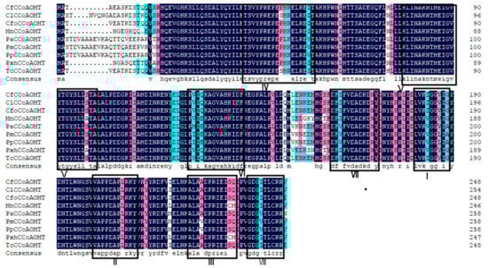 Multiple sequence alignment of the CfCCoAOMT protein using 9 plant species. The species represented by the abbreviations on the left side of the figure and their registration numbers in NCBI are as follows: CfCCoAOMT (C. fortunei, MK236394), CfoCCoAOMT (Chamaecyparis formosensis, ABB89956.1), TcCCoAOMT (Taiwania cryptomerioides, ABB87184.1), ClCCoAOMT (Cunninghamialanceolata, AFX98065.1), CofCCoAOMT (Chamaecyparis obtusa var. formosana, ABB87185.1), PaCCoAOMT (Picea abies, CAK18782.1), PpCCoAOMT (P. pinaster, AFL65039.1), PmCCoAOMT (P. massoniana, AHL67654.1), AtCCoAOMT (Amborella trichopoda, XP_006856484.1), MnCCoAOMT (Morus notabilis, XP_010107916.1), PxhCCoAOMT (Petunia x hybrida, ALP75648.1).
