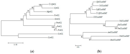 Phylogenetic trees of 4CL (a) and CCoAOMT (b) proteins using the most closely related protein sequences from 9 (a) and 10 (b) plant species. Displayed are tree diagrams of the interrelationships between the branches of each biological lineage, constructed according to their phylogeny to indicate the genetic relationship between species. Trees were generated using the unrooted Maximum Likelihood algorithm trees with MEGA 6.0 software. Bars represent genetic distance.