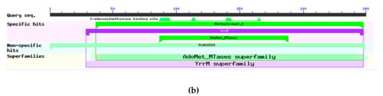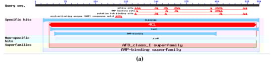 Protein domain analysis of Cf4CL (a) and CfCCoAOMT (b) proteins in C. fortunei. The figure was constructed with NCBI conserved domains. Specific hits are the top-ranking RPS-BLAST hits (compared to other hits in overlapping intervals) that meet or exceed a domain-specific E-value threshold (details and illustration). Non-specific hits meet or exceed the RPS-BLAST threshold for statistical significance. Superfamily is the domain cluster to which the specific and/or non-specific hits belong.