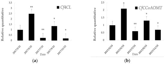 Expression of Cf4CL (a) and CfCCoAOMT (b) in C. fortunei vascular cambium during the different growth stages throughout the year. Plotted are means +/− standard deviation (n = 6 replications for each growing stage). p values were calculated with t-test, * p < 0.05, ** p < 0.01.
