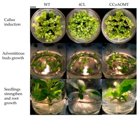 Overexpression of Cf4CL and CfCCoAOMT initially impedes tobacco growth. The first to third columns show representative images of wild type, Cf4CL transfected, and CfCCoAOMT transfected leaves, respectively. The first to third rows successively show the callus induction, adventitious bud growth, and seedling strengthening/root growth phases. A total of 3 seedlings were randomly chosen for measurements of each genotype. Bar equals 1 cm.