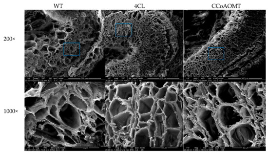 Representative SEM micrographs of tobacco stem cross sections, taken at 200× and 1000×. The first to third columns show wild type, Cf4CL and CfCCoAOMT transfected tobacco respectively. The pictures at 1000× show part of the pictures taken at 200×, indicated by a blue square.