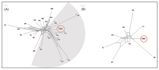 Neighbor-network trees based on Reynolds genetic distance of 23 horse breeds. (A) Distance mapping of the ENH (circled) and 22 breeds created two subpopulations; breeds indicated with asterisks (*) in the grey-shaded area belong to Group A in Figure 1. (B) Distance mapping of the ENH (circled) with 8 related breeds. Branch length indicates population divergence. Breed abbreviations are the same as in Figure 1.