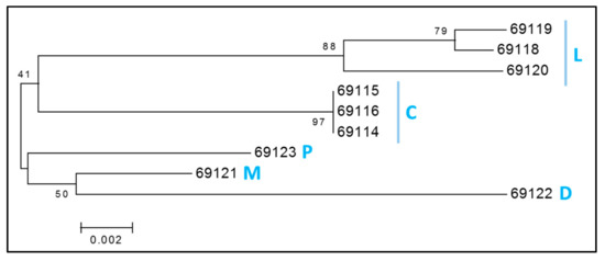 - Felsenstein, J. PHYLIP (Phylogeny Inference Package) version 3.6; Distributed by the author; Department of Genome Sciences, University of Washington: Seattle, WA, USA, 2004. [Google Scholar]