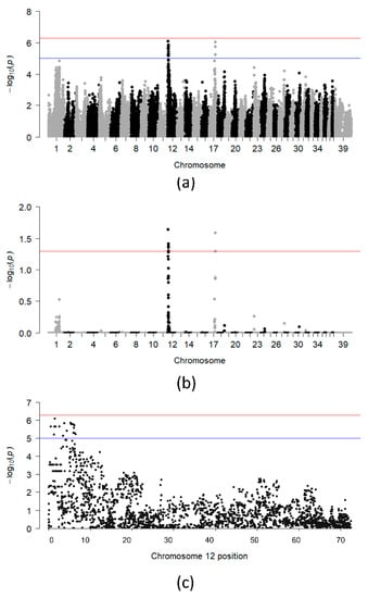 Chi-square based allelic association (a) and association test after 100,000 permutations (b) for the entire dataset. (c) Plot showing −log10 of the raw p-values for each SNP on CFA 12. The blue and red lines indicate suggestive (−log10[p-value] ≥ 5) and Bonferroni-adjusted genome-wide significance threshold (−log10[p-value] ≥ 6.3), respectively.