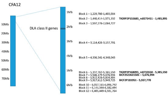 Despite the evident association between blocks 1–5 and DLA class II risk haplotypes for SLO, no haplotype blocks were seen overlapping the DLA class II genes. In fact, the gap that exists between CFA12 haplotype blocks 3 and 4 overlaps the entire DLA class II region (classical and extended) []. Fifty Illumina SNPs are distributed throughout the region, but half of these SNPs were removed from analysis during quality control due to minor allele frequency below 5% or missing genotype calls. Even though two of the SNPs that passed quality control were located in DLA-DRB1 and one in DLA-DQA1, neither showed an association with SLO in the dataset. As previously reported [], these SNPs are probably not able to capture the diversity in DLA class II haplotypes seen in dogs through the sequencing of exon 2 in each of the three polymorphic genes (DLA-DRB1, -DQA1 and -DQB1) []. This could explain the lack of association between those SNPs and SLO despite the strong association seen with particular DLA class II haplotypes. As previously mentioned, the strong LD in the region makes it difficult to determine which variants are truly associated with disease expression and which ones are simply in LD with the causative variants. Therefore, whereas the DLA class II haplotypes show a very strong association with SLO expression in these dogs, the actual causative mutation might be adjacent to the DLA genes. This could also explain the gap in haplotype blocks where the DLA class II genes are located. Moreover, researchers have demonstrated that, in humans, multilocus balancing selection occurring on the human leukocyte antigen (HLA) genes can potentially maintain deleterious mutations within the extended HLA region, particularly when these mutations have moderate effects, such as in late-onset autoimmunity. The benefits of maintaining heterozygosity of the HLA genes, and consequently broader immune surveillance, are likely greater than negative-effect deleterious variants linked to individual HLA haplotypes. In fact, many GWAS in human diseases show peaks in the broad HLA region, with non-HLA associations with phenotype []. The same may be true for dogs with deleterious mutations in non-DLA genes hitchhiking in the background of particular DLA haplotypes.