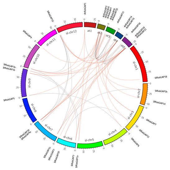 Syntenic relationships among RabGAP. Paralogy and orthology relations between RabGAP from S. lycopersicum and Arabidopsis thaliana. Orthologous and paralogous genes are connected by red and gray lines, respectively.