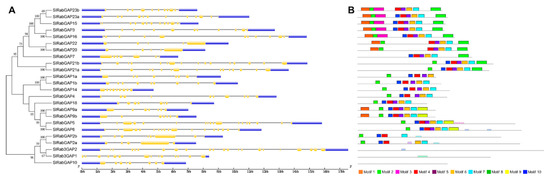 Identification of exon-intron structure and conserved motifs in RabGAP from S. lycopersicum. (A). Exon-intron structure of RabGAP genes from S. lycopersicum. In yellow, exons; in blue, the 3′ and 5′ UTR regions; and the gray lines are introns. (B) Conserved motif of RabGAP proteins. Ten motifs were identified with MEME database. The gray lines are the complete amino-acid sequence represented proportionally. Each color represents a different motif. Together, the pink, red, purple, orange, and light blue motifs represent the TBC domain. The consensus sequences are detailed in Table S2.