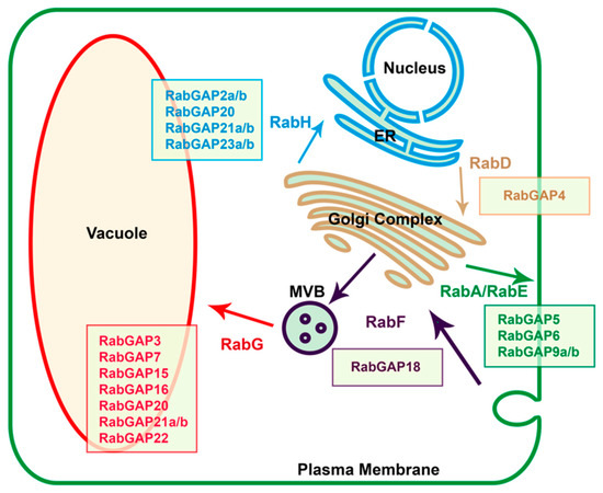 - Woollard, A.A.; Moore, I. The functions of Rab GTPases in plant membrane traffic. Curr. Opin. Plant Biol. 2008, 11, 610–619. [Google Scholar] [CrossRef] [PubMed]