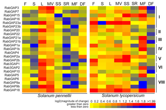 Expression patterns of RabGAP genes in different tissues, organs and developmental stages of tomato. Induction of genes is represented in red and repression in blue. F: flowers, S: shoots, L: leave, MV: vegetative meristems, SS: seedling shoots, SR: seedling roots, MF: mature fruit, DF: developing fruit. All values are detailed in Table S5.