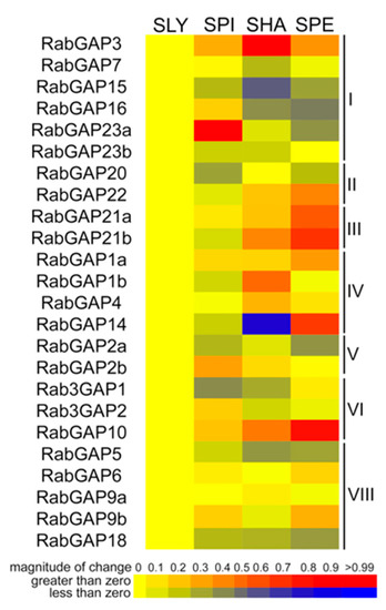 Expression profiling of RabGAP genes in wild tomato species. Transcript levels of RabGAP genes from wild tomato species relative to S. lycopersicum are represented. Higher or lower gene expressions are shown in red and dark blue, respectively. Nomenclature: SLY: S. lycopersicum, SPI: S. pimpinellifolium, SHA: S. habrochaites and SPE: S. pennellii. All values are detailed in Table S6.