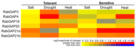 To obtain more information about the role of RabGAP genes under abiotic stress conditions, we analyzed their expression profiles in response to heat, drought and salt stress in S. lycopersicum and compared them with those results obtained in wild relatives. In this case, the only data available for the RabGAP3, -4, -18, -20, -21a, and -21b were found in different databases (see Figure 7). During heat stress, only RabGAP4 and -20 were as strongly induced in the tolerant species as RabGAP4, -21a, and -21b were in the S. lycopersicum. Interestingly, under conditions of drought stress, unlike heat stress, RabGAP3, -4, -18, -20, and -21b of tolerant species versus RabGAP21a and -21b of S. lycopersicum, were up-regulated. Finally, under salt stress, similar expression profiles were observed in the sensitive and tolerant species. In this case, RabGAP21a and -21b were the most up-regulated genes in both species.