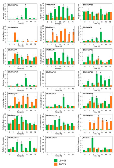 Spatio-temporal expression patterns of RabGAP genes of S. lycopersicum exposed to salt stress. Relative levels of SlRabGAP gene transcripts in roots (orange bar) and leaves (green bar) of 10–12-week-old S. lycopersicum plants were determined at 0, 3, 6, 12, 24, 48, and 72 h after stress initiation with 300 mM NaCl. The relative levels of the salt-stress marker gene (SlAREB1) were measured. In SlRabGAP14 and -23b, transcripts were not detected. Columns and error bars represent the mean and standard deviation for three biological and three technical replicates. * p-value < 0.05.