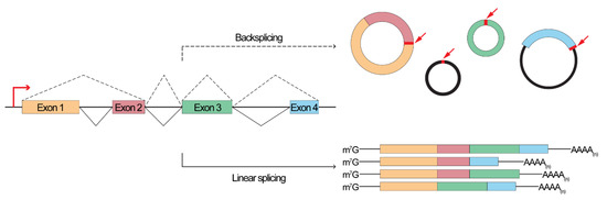Linear vs Circular splicing. Circular RNAs (circRNAs) are formed from an unusual splicing event that results in covalently linked 3′–5′ ends termed as a backsplice junction (top, indicated by a red arrow). As for linear transcripts (bottom), circRNAs can undergo alternative splicing, resulting in different classes of transcripts (mono or multi exonic, intronic, exon-intron structure).