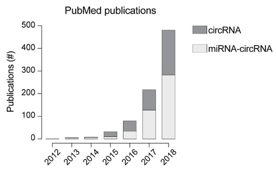 The high stability and the presence in different body fluids make circRNAs extremely promising disease biomarkers. Given their diagnostic relevance, a lot of efforts have been put in the functional characterization of circRNAs, as this is critical to understand their role in disease development or progression and to provide crucial insights into their physiological role. It has been shown that nuclear circRNAs can be involved in regulating mRNA expression at the level of transcription by interacting with RNA polymerase or with members of the spliceosome machinery [], for example. Conversely, cytoplasmic circRNAs seem to be involved in post-transcriptional regulation, sequester RNA-binding proteins [,] or even can be translated into small peptides [,]. Considering post-transcriptional regulation, one of the first and most investigated functions of circRNAs is miRNA sponging (Figure 2) [,,,,]. In fact, in the past couple of years the number of papers involving circRNA-miRNA interaction has grown almost exponentially and, in 2018, represented ~60% of circRNA-related publications (Figure 3). Despite the increasing number of studies focusing on circRNA-miRNA interactions, to generalize this specific function to the entire “circ-ome” still remains challenging. The first, and most important, issue in this regard is the definition of “sponging” or, more appropriately, of competing endogenous RNAs (ceRNAs). Whether the ceRNAs hypothesis [] is sufficient to explain the function of thousands of poorly characterized ncRNAs is still an argument worthy of great debate (refer to Thomson and Dinger [] for more details). Nevertheless, it is crucial to consider the evidence that the expression alone of a ceRNA (in our case specifically, circRNAs) might not be sufficient to have a measurable effect on highly expressed miRNA and, therefore, on its downstream targets [], while the impact on lowly expressed ones could be more significant []. This has a major consequence in the definition of the minimum characteristics that a circRNA must hold (e.g., expression, number of possible miRNA response elements—MREs—and miRNA expression itself) to be considered a miRNA sponge. Taking into account that, overall, circRNAs are expressed at lower levels than other RNAs [,,,] and that the expression is tissue- and cell-type-specific [,,,,,,], the presence of a relatively high number of MREs for the same miRNA within the sequence of a single circular RNA would be expected. Different studies have shown that, beside CDR1as, only a very limited number of circRNA exhibit this property [,], pointing strongly toward the idea that sponging is an exception, rather than a general function.