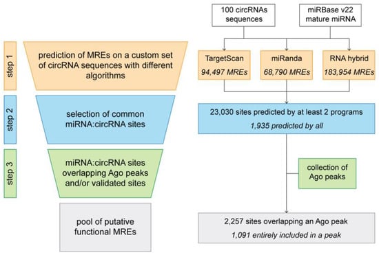 A possible pipeline for the comprehensive assessment of circRNA:miRNA binding sites starting from a custom set of expressed circRNA sequences (left) and a practical example on the outcome of each step on a set of randomly chosen sequences from previous work [] (right).