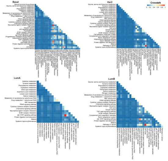 The crosstalk for each two interrelated risk pathways in breast cancer subtypes. Heat maps of crosstalk between risk pathways for comparing the heterogeneity of crosstalk across different subtypes of breast cancer. The color of the box represents the crosstalk between the two pathways, the lower and higher crosstalk are represented by blue and the red colors, respectively.