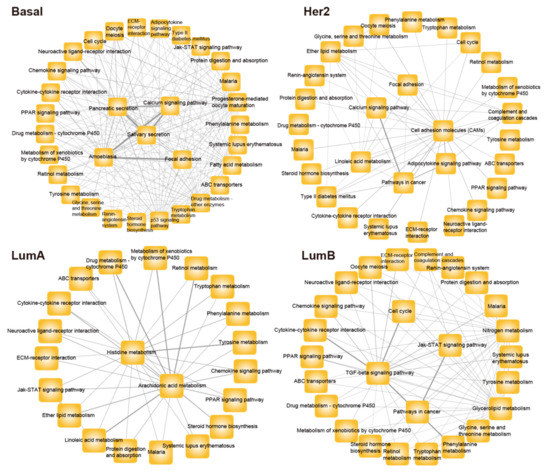 Moreover, we found some subtype-specific crosstalk of pathways in breast cancer. We extracted the specific crosstalk risk pathways of each subtype and used them to construct the specific crosstalk network of the risk pathway in four subtypes (Figure 4). There are 197 specific crosstalk relationships in basal-like, 56 specific crosstalk relationships in her2-enriched, 41 specific crosstalk relationships in luminal A, and 74 specific crosstalk relationships in luminal B subtypes. The above results indicate that these subtype-specific crosstalks of risk pathways may be one of the molecular mechanisms that lead to distinct clinical outcomes of breast cancer patients, which will help us to understand the discrepancy between subtypes and points a new way to optimize the treatment of breast cancer patients.