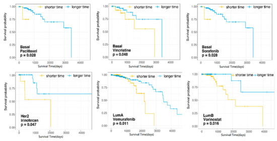 A drug could specifically interact with a target molecule to modulate a physiological process and further impact the progression of a disease [34]. In order to further screen drugs for breast cancer patients, we got the patients’ clinical survival information in each breast cancer subtype. For each candidate therapeutic drug that was screened based on DS score in different subtypes, we evaluated the drug target signature’s influence on patient survival. Patients from each subtype of breast cancer were divided into two groups (shorter survival time group and longer survival time group) based on the expression of drug target signatures. As shown in Figure 5, we found that there were, in total, six candidate therapeutic drugs screened based on DS score (DS score greater than zero) that significantly correlated with overall survival (OS) in the different subtypes of breast cancer patients. Paclitaxel, Vincristine, and Sorafenib in basal-like, Irinotecan in her2-enriched, Vemurafenib in luminal A, and Vorinostat in luminal B subtypes. These six dugs not only impacted the crosstalk of risk pathways, but they also had an effect on the patients’ survival in their corresponding subtypes. This indicates that they may be more suitable treatment candidates for the corresponding subtypes of breast cancer. More details, according to drug target signatures of Paclitaxel and Sorafenib in the basal-like subtype, these 97 patients were divided into a shorter survival group (n = 5) and a longer survival group (n = 92), respectively. Vincristine drug target signatures divided 97 patients in the basal-like subtype into a shorter survival group (n = 63) and a longer survival group (n = 55). The 47 patients in the her2-enriched subtype were separated into a shorter survival group (n = 10) and a longer survival group (n = 37) by Irinotecan drug target signatures. Based on the drug target signatures of Vemurafenib in luminal A subtype, the 287 patients (survival information was missing in four patients) were stratified into a shorter survival group (n = 78) and a longer survival group (n = 209), and Vorinostat drug target signatures stratified 118 luminal B subtype patients into a shorter survival group (n = 63) and a longer survival group (n = 55). Here, drugs’ signatures stratified the patients into two groups in a statistically significant manner and their expression direction were not considered.