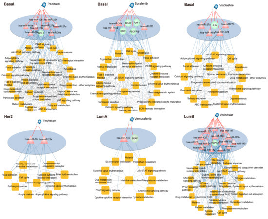 In our drugs’ optimization results, Paclitaxel, Sorafenib, and Vincristine were found to have potential therapy effect in the basal-like subtype of breast cancer. Consistent with clinical findings, Paclitaxel and Vincristine were the optimal adjuvant therapy for triple-negative breast cancer [35,36]. Sorafenib is a multiple targeted agent which can inhibit tumor cell proliferation and angiogenesis by inhibiting the activation of multiple different kinases [37], and our results indicate that Sorafenib plays a therapeutic role in the basal-like subtype of breast cancer mainly through affecting specific risk pathway crosstalk mediated by hsa-miR-30a, hsa-miR-222, and hsa-miR-193a. Some studies have confirmed that hsa-miR-30a, hsa-miR-222, and hsa-miR-193a play key roles in breast cancer [38,39,40]. Irinotecan, an antitumor enzyme inhibitor mainly used for the treatment of colorectal cancer [41], is suitable for the her2-enriched subtype, which mediates the specific crosstalk among the risk pathways of the her2-enriched subtype through regulating hsa-miR-23a and hsa-miR-324. In accordance with the result of WT Kuo and Eissa [42,43], hsa-miR-324 and hsa-miR-23a have distinct biological functions in breast cancer. Vemurafenib has long been approved for the treatment of metastatic melanoma with BRAF mutation [44], and our results showed that this drug had a damaging effect on the specific crosstalk of risk pathway of the luminal A subtype through action on hsa-miR-145. Just as some researches have shown that miR-145 is a potential cancer biomarker and serves as a novel target for cancer therapy, including breast cancer [45]. Vorinostat as an anticancer agent that inhibits histone deacetylases, approved for cutaneous T-cell lymphoma [46], and plays a key role in the epigenetic regulation of gene expression. Vorinostat could act on the specific risk pathways crosstalk of the luminal B subtype via 14 miRNAs (Figure 6), which have been found to play important roles in the occurrence and development of breast cancer, such as hsa-miR-155, hsa-miR-34a, hsa-miR-17, hsa-miR-22, and hsa-miR-140 [47,48,49,50,51].