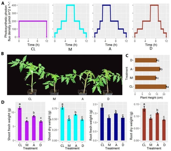 Experimental design and measurements of fresh and dry weight of shoots and roots, respectively. (A) Light distribution patterns of control (CL), treatment 1 (M), treatment 2 (A), and treatment 3 (D). (B) Morphological comparisons between different treatments after five weeks (n = 8). (C) Comparison of plant height between different treatments after five weeks. (D) Comparisons of shoot fresh weight, shoot dry weight, root fresh weight, and root dry weight between different treatments after five weeks. Different lowercase letters indicate a significant difference among the same treatments (p < 0.05). Each bar represents the mean ± SE (standard error) of eight biological replicates.