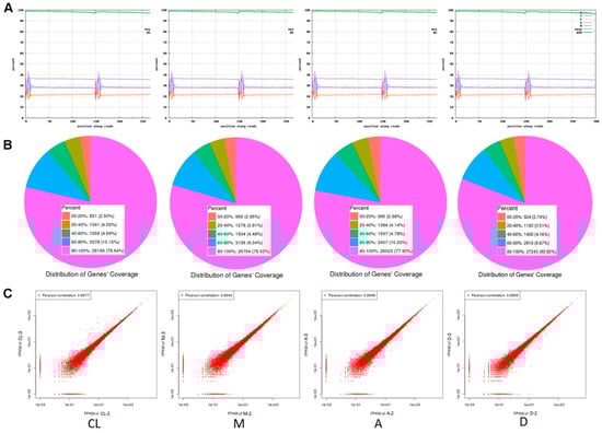 Transcriptome sequencing quality analysis between treatments and control. (A) Base composition and quality distributions. (B) Statistic maps of gene coverage. (C) Correlation coefficient maps between different sequencing repeats.