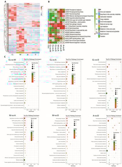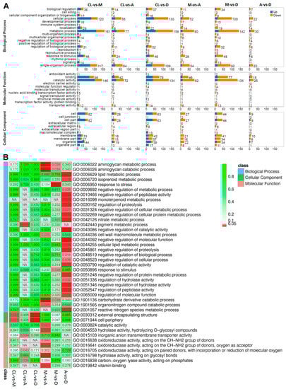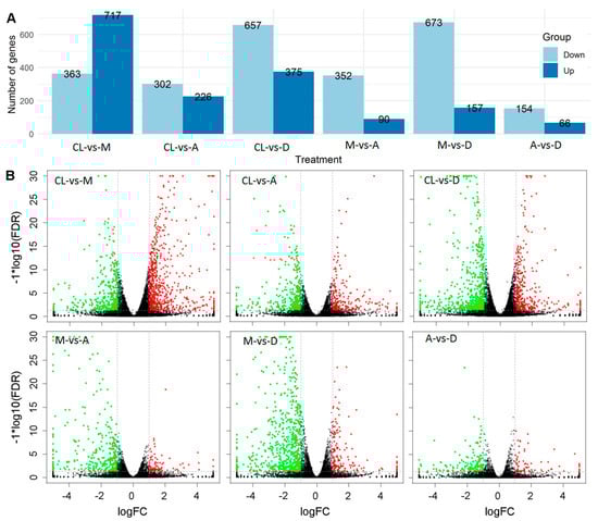 Differentially expressed genes (DEGs) between treatments and control were identified using edgeR software [38,39]. FDR and log2FC were used to screen for DEGs. The screening conditions were FDR < 0.05 and |log2FC| > 1. Hundreds of genes were up- or down-regulated between control and treatments, as well as between different treatments (Supplementary Tables S2–S8). The total number of significantly regulated genes differed in different comparisons (Figure 3A). The largest difference was found between treatment M and control (1080 significant up-/down-regulated genes), followed by treatment D and control (1032 significant up-/down-regulated genes). In general, the number of up-regulated genes was lower than that of down-regulated genes, with the only exception between treatment M and control. In particular, the largest difference between the numbers of down-regulated and up-regulated genes was found between treatments M and D, reaching a total of 416 genes (Figure 3A). The smallest number of significantly regulated genes was found between treatment A and D, with 66 and 154 significantly up- and down-regulated genes, respectively. Volcano plots show that the number of up-and down-regulated genes had a distinct distribution pattern between the three DL treatments and control (Figure 3B). For example, the distribution pattern of down-regulated genes of treatment A was much higher than the patterns of treatments A and D, respectively. Although the number between down- and up-regulated genes was low between treatments A and D compared with other treatments, the distribution patterns were quite similar (Figure 3B). These results show clear global gene expression patterns between different treatments and control.