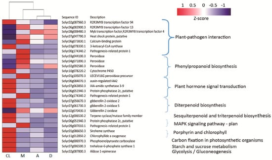 The tomato plant development is a very complex process. The RNA-seq data shows that common DEGs were involved in many relevant pathways where they modulate metabolic processes, such as the plant–pathogen interaction, phenylpropanoid biosynthesis, plant hormone signal transduction, biosynthesis of terpenoids, and photosynthetic metabolic processes (Figure 7). Three of the DEGs involved in plant –pathogen interaction belonged to the R2R3-MYB transcription factor family, which is involved in stress responses and biosynthesis of secondary metabolites. In particular, one gene (Solyc02g087960.3) was down-regulated and two genes (Solyc06g083900.3 and Solyc08g008480.3) were up-regulated compared with the CL. In addition, heat shock protein (Solyc07g047790.3), calcium-binding protein (Solyc06g073830.1), and pathogenesis-related protein 1 (Solyc00g174340.2) were all up-regulated in response to M treatment. However, 3-ketoacyl-coA synthase (Solyc03g078330.1) was down-regulated under all DL treatments.