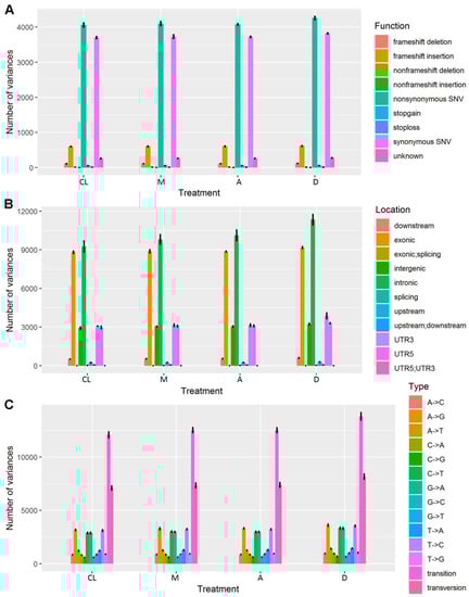 Transcriptome sequencing also identified various single nucleotide polymorphisms (SNPs) (Figure 8). Up to nine types of functional variations were identified for each control and DL treatment, such as frameshift/nonframeshift deletion/insertion, and synonymous/nonsynonymous single nucleotide variants (SNV) (Figure 8A). Among these, nonsynonymous SNV and synonymous SNV represented dominant functional variations, with overall similar trends for all types of functional variations (Figure 8A). In addition, these SNPs were located in different locations, with dominant locations in exonic and intronic locations, both of which were highest between all DL treatments and control (Figure 8B). All mutations were identified in each treatment, with transition and transversion as the two dominant types (Figure 8C). These results demonstrate a comprehensive transcriptional regulation in tomato under different light intensity regimes.