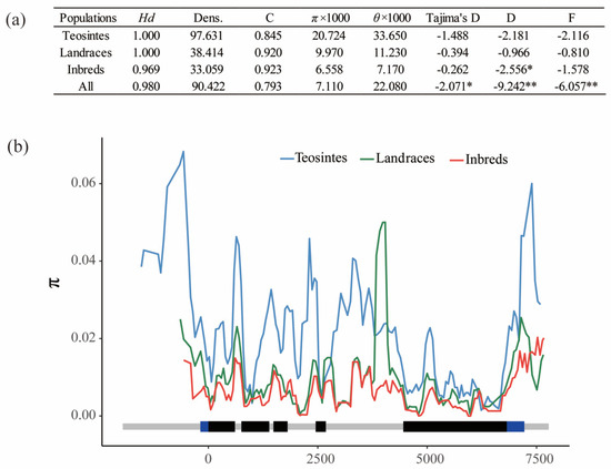 Nucleotide diversity in inbred lines, landraces, and teosinte. (a) Summary of nucleotide polymorphisms and neutrality test of ZmPGP1, Hd represents haplotype diversity, Dens denotes number of single nucleotide polymorphisms (SNP) per 1000 bp, C represents sequence conservation, and D* and F* represent Fu and Li’s D*and F*. (b) Nucleotide diversity (π) of inbred lines, landraces, and teosinte. π was calculated using the sliding windows method with a window size of 100 bp and a step length of 25 bp. * indicates a statistical significance at p < 0.05 level, ** indicates a statistical significance at p < 0.01 level.