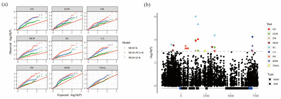 To identify significant variants associated with phenotypic traits, association analysis was performed using 499 variants, including 269 SNPs and 230 InDels with minor allele frequency (MAF) ≥0.05 in 349 inbred lines. Three mixed linear models (MLM), MLM + K, MLM + Q + K, and MLM + PCA + K, were employed to perform marker-traits association analysis. Comparing the Quantile-Quantile (QQ) plots generated for these models, we selected MLM + PCA + K to minimize both false positives and false negatives (Figure 2a).