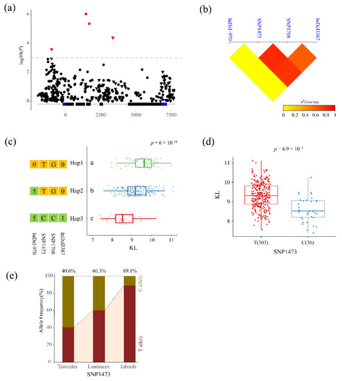 Linkage disequilibrium (LD) analysis found that SNP438, SNP453, SNP555, SNP628 and SNP706 showed strong LD (r2 > 0.95) with each other in inbred lines. After the clumping of variants, 11 significant sites were identified. Six major haplotypes which contained more than 10 lines emerged from the 11 significant sites across inbred lines, and a significant phenotypic difference was observed between haplotypes in 8 traits, except for TMAL (Table S2). Four significant variants were significantly associated with KL, including InDel-970, SNP1473, SNP1708, and InDel3387. Three major haplotypes, which contained more than 20 lines, emerged from the 4 significant sites across 349 inbred lines (Figure 4c). The phenotypic differences in KL between the three major haplotypes were compared, and a significant difference was detected by ANOVA (p = 6 × 10−10) between haplotypes. Hap1, carrying all increased alleles, had the longest kernel length, followed by Hap2, which included the majority of tested inbred lines. Hap3, carrying all decreased alleles, had the shortest kernel length. SNP1473 was the most significant sites, the allele T group had a significantly longer KL than the allele C group (p = 6.9 × 10−8, Figure 4d). Further, we analyzed the allele frequencies among the three populations. The results showed that the frequency of the SNP1473T in teosintes was 40.6%, and in landraces and inbred lines, the frequency increased to 60.3% and 89.1%, respectively (Figure 4e). These results suggested that SNP1473 might have been selected during domestication and improvement of maize. Three variants at sites 1473, 1708, and 3387 were significantly associated with EGW, which could divide the tested inbred lines into 2 major haplotypes (Figure S1). A significant difference between haplotypes was observed for EGW (p = 1.3 × 10−4). The SNP at site 1473 also had the most significant association with EGW. Three variants were identified for HKW that divided the inbred lines into four groups (Figure S2). The HKW of Hap1 was higher than the other three haplotypes (p = 8.3 × 10−9). The most significant site was SNP-769, and the frequency of the increased allele, SNP-769T, increased from 8.3% in teosintes to 33.3% in inbred lines. Five SNPs with high LD (r2 > 0.95) were significantly associated with PH. The plant height in the inbred lines carrying allele SNP453G was higher than those containing the C allele (Figure S3). The frequency of the G allele decreased from 50.0% in teosintes to 16.1% in inbred lines. Two SNPs significantly associated with RDW divided the tested inbred lines into 3 major haplotypes (Figure S4). The frequency of increased allele SNP7137C increased from 0 in teosintes to 74.1% in inbred lines.