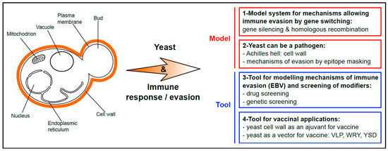 Scheme summarizing the various use of yeast to explore and modulate immune response and immune evasion. Yeasts are fungi and, as such, possess a cell wall that surrounds their plasma membrane, in addition to the typical features of eukaryotic cells (that include existence of a nucleus, mitochondria, vacuoles which are hydrolytic organelles similar to the lysosomes in higher eukaryotes, endoplasmic reticulum etc.). 1. Yeast is a model system for mechanisms based on gene repression and switching that allow immune evasion of many parasites. 2. Yeast can also be a pathogen, notably for humans and animals. Its cell wall is highly antigenic, and yeast has developed various mechanisms of epitope-masking to evade the host immune system. 3. Yeast is a tool for modelling the mechanism that allows immune evasion of the Epstein–Barr virus (EBV). This system has been successfully used to isolate drugs interfering with EBV stealthiness and to identify host cell factors involved in immune evasion of this oncovirus. 4. The antigenicity of the yeast cell wall has been biotechnologically exploited as an adjuvant for vaccination. In addition, yeast cells, heat-killed or alive, have been directly used as vectors for various antigens, hence combining the vaccine and the adjuvant in the same particle (VLP, virus-like particle; WRY, whole recombinant yeast; YSD, yeast surface display).