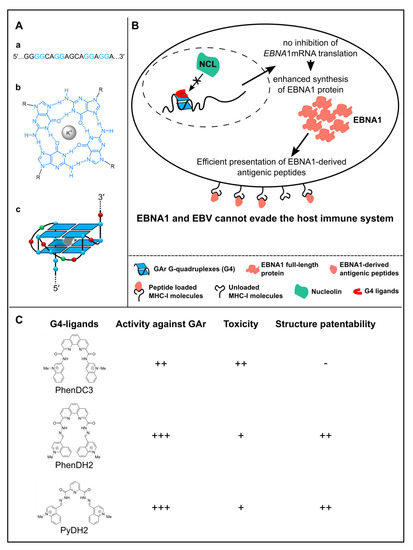 - Lista, M.J.; Martins, R.P.; Billant, O.; Contesse, M.A.; Findakly, S.; Pochard, P.; Daskalogianni, C.; Beauvineau, C.; Guetta, C.; Jamin, C.; et al. Nucleolin directly mediates Epstein-Barr virus immune evasion through binding to G-quadruplexes of EBNA1 mRNA. Nat. Commun. 2017, 8, 16043. [Google Scholar] [CrossRef] [PubMed]