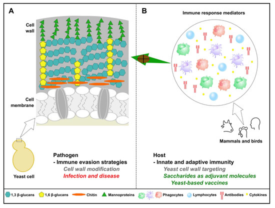 Importance of yeast cell wall components in immune detection and vaccine development. (A) Yeast has evolved a sophisticated cell wall enabling better adaptation to harsh environmental conditions. Pathogenic fungi can further modify cell wall components to resist host immune response pressure and cause disease. (B) On the other hand, carbohydrates abundantly found in yeast cell wall are absent in mammals and poultry birds, enabling efficient recognition of yeast cells by the host immune surveillance mechanisms, in particular by the innate immune system. This particularity has been exploited for the development of new adjuvant molecules and yeast-based approaches as alternatives to alum-adjuvanted subunit vaccines.