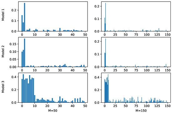 Estimated pathway weights by PKB in simulation studies. The X-axis represents pathways and the Y-axis represents estimated weights. Based on the simulation settings, the first three pathways are relevant in Models 1 and 2 and the first ten pathways are relevant in Model 3. M represents the number of simulated pathways.
