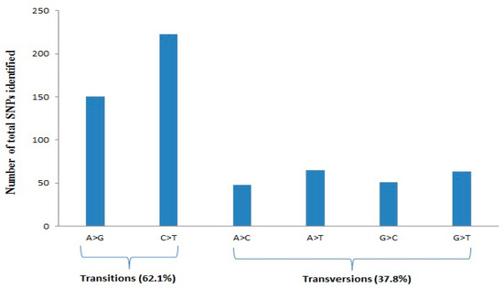 During the last decade, single nucleotide polymorphism (SNP) markers have been developed and increasingly utilized as highly-preferred molecular markers in various crop species because of their wide genome coverage, co-dominant inheritance, chromosome-specific location, low cost, and fast tracking in comparison to other polymerase chain reaction (PCR)-based molecular markers [18,19]. SNP markers are mainly developed based on next generation sequencing technology. Fast development of SNP markers through genotyping-by-sequencing (GBS) has paved the road to facilitating genomics-assisted breeding through quantitative trait loci (QTL) and genome-wide association analysis in diverse crops [20,21]. Recently, diversity array technology (DArT) developed a GBS method called “DArTseq” for genotyping with high-density SNP in different crop species such as wheat [22], common bean [23], sesame [8], tomato [24], snake melon [25], and chickpea [26].
