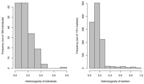 Frequency of heterozygous genotypes and heterozygosity of 1152 SNP markers generated by DArTseq platform in 186 chickpea genotypes.