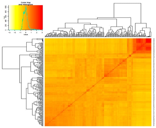 Heat map plot of kinship matrix using average linkage clustering based on SNP markers depicts the existence of four different groups among chickpea genotypes. The details of members of these groups are presented in Table S3.