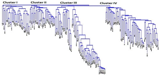 Kinship values calculated between pairs of genotypes are a reliable factor for understanding the extent of relatedness between chickpea genotypes [24,50]. Kinship values close to zero indicate unrelated germplasm, while those close to 0.5 or higher (which around 66% of the pairs of genotypes in this study had) refer to full sibs or highly similar germplasm. Average genetic distance (GD) between pairs of genotypes was 0.31, while 88% of pairs of genotypes showed GD of more than 0.25, indicating that high genetic variability were presented among chickpea genotypes. The different approaches (STRUCTURE, PCoA, and DAPC) used to analyze the structure of the chickpea germplasm appeared to provide complementary information. The neighbor joining tree divided the chickpea genotypes into four main clusters, which are in complete concordance with the structure and PCoA analysis results. These results suggest that the crossing among inter-cluster genotypes may develop cultivars with promising agronomic traits.