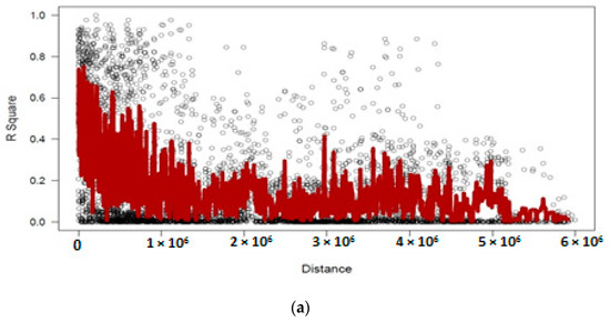 Chickpea is a self-pollinated crop, and it is assumed that all chickpea genotypes in the present study had been held several generations via self-pollination; therefore, they were expected to be mostly homozygous. The low level of heterozygosity in the chickpea panel suggests that the genotypes we used in this study were close to being inbred lines and homozygous. Average inter-chromosomal LD decay of SNP markers showed long distances for marker pairs in LD (Figure 8), which may be attributed to genetic admixture, apart from the genetics or physical distances as has been previously reported in chickpea and other crops [26,49].