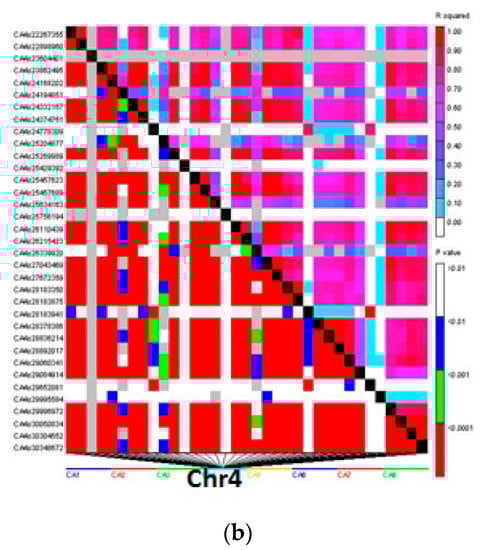 Linkage disequilibrium (LD)-measured r2 plotted vs. the physical map (bp) between pairs of DArTseq-SNP markers in a panel of 186 chickpea genotypes (a), which show the huge LD decay on Chr4 (b).