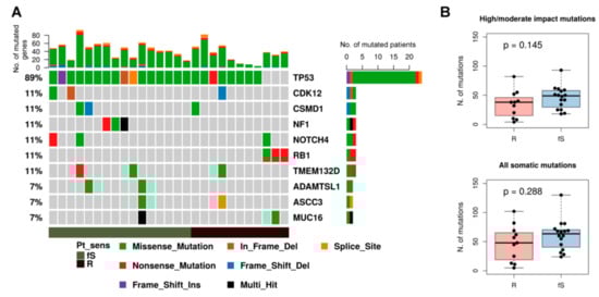 We compared the tumor mutational load in the two sensitivity classes considering either only mutations with high/moderate impact (Figure 1B upper panel) or all somatic mutations (Figure 1B lower panel); even if fS patients tend to have a slightly higher number of mutations, we did not detect significant differences between the two classes.